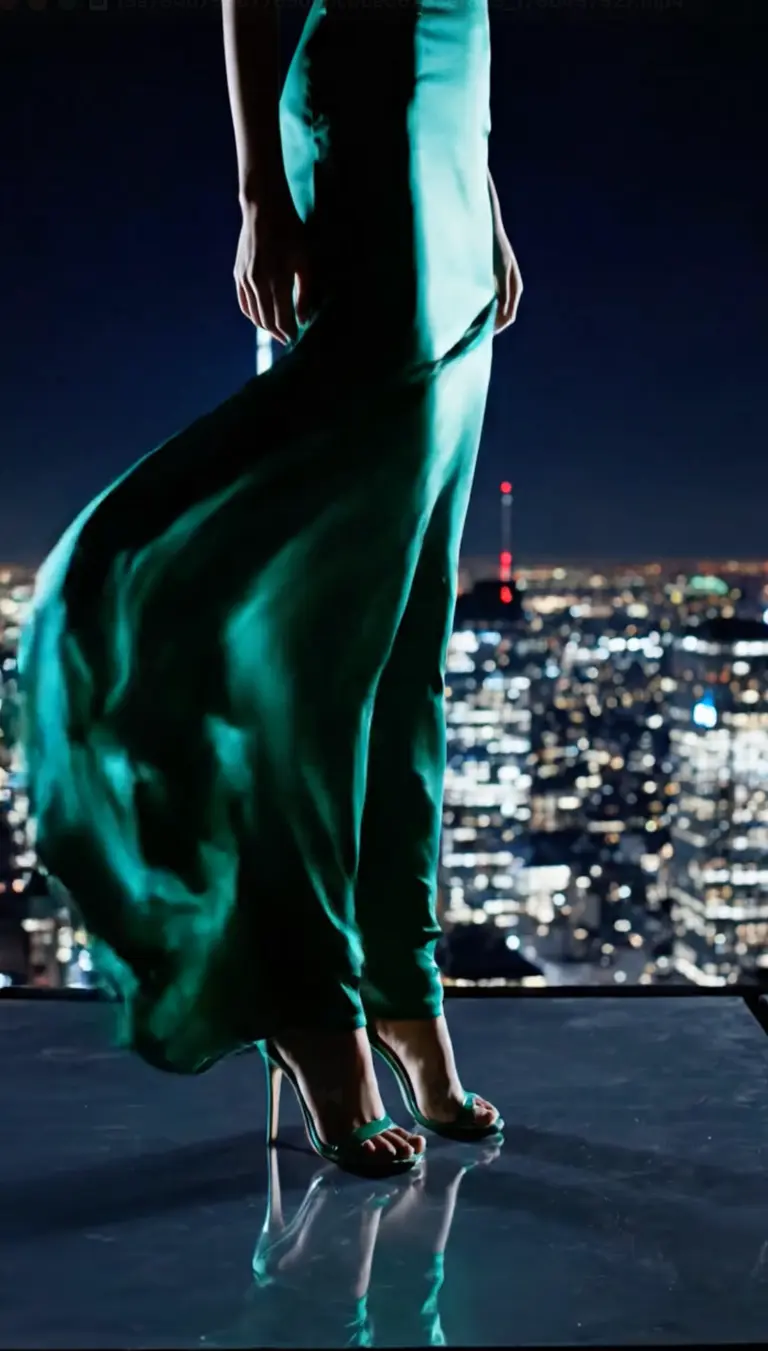 Вертикальный кинематографичный кадр: элегантная девушка в длинном вечернем платье стоит на крыше небоскрёба ночью. Ветер развевает ткань платья, город сияет огнями внизу. Камера медленно поднимается снизу вверх, подчёркивая силуэт. Роскошный fashion-стиль, глянцевый свет, глубокие тени, ultra high-end quality.