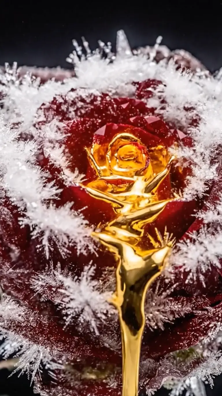 Кинематографичный макро-план: живая красная роза мгновенно покрывается кристаллами льда. Внутри лепестков начинает пульсировать расплавленное золото. Смена текстур от органики к драгоценному камню. Сюрреализм, 8k, дорогой визуальный стиль.