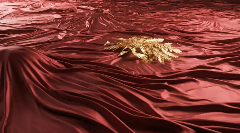 Бескрайнее море из движущейся красной шелковой ткани. Сюрреалистичные складки ткани имитируют океанские волны. Золотая маска с перьями медленно качается на поверхности. Глубокие тени, кинематографично.