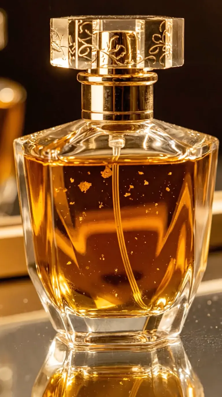 Крупный план изящного стеклянного флакона духов с золотой крышкой. Внутри флакона плавают частицы сусального золота. Флакон стоит на зеркальной поверхности, вокруг медленно кружится золотая пыльца. Освещение мягкое, студийное