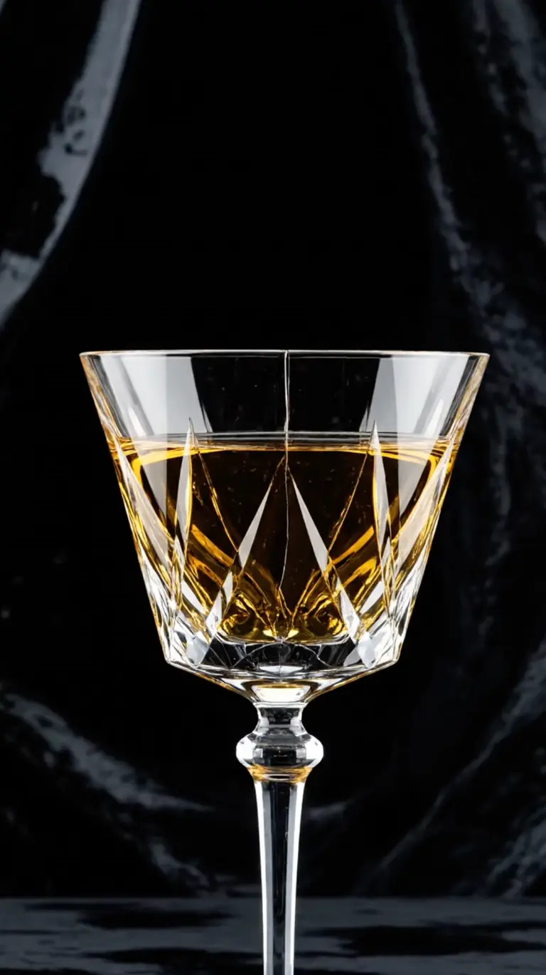 Slow motion: хрустальный бокал разлетается на осколки, золотая жидкость внутри застывает в невесомости и принимает форму идеальных зеркальных сфер. Осколки хрусталя сияют как бриллианты. Атмосфера люкса.