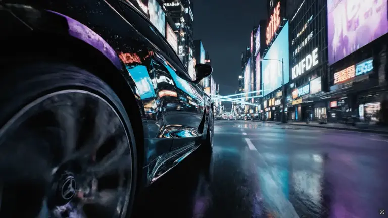 Черный глянцевый автомобиль едет по ночному мегаполису. Отражения неоновых вывесок плавно скользят по кузову. Камера движется параллельно колесу. Стиль: киберпанк-люкс, глубокие тени