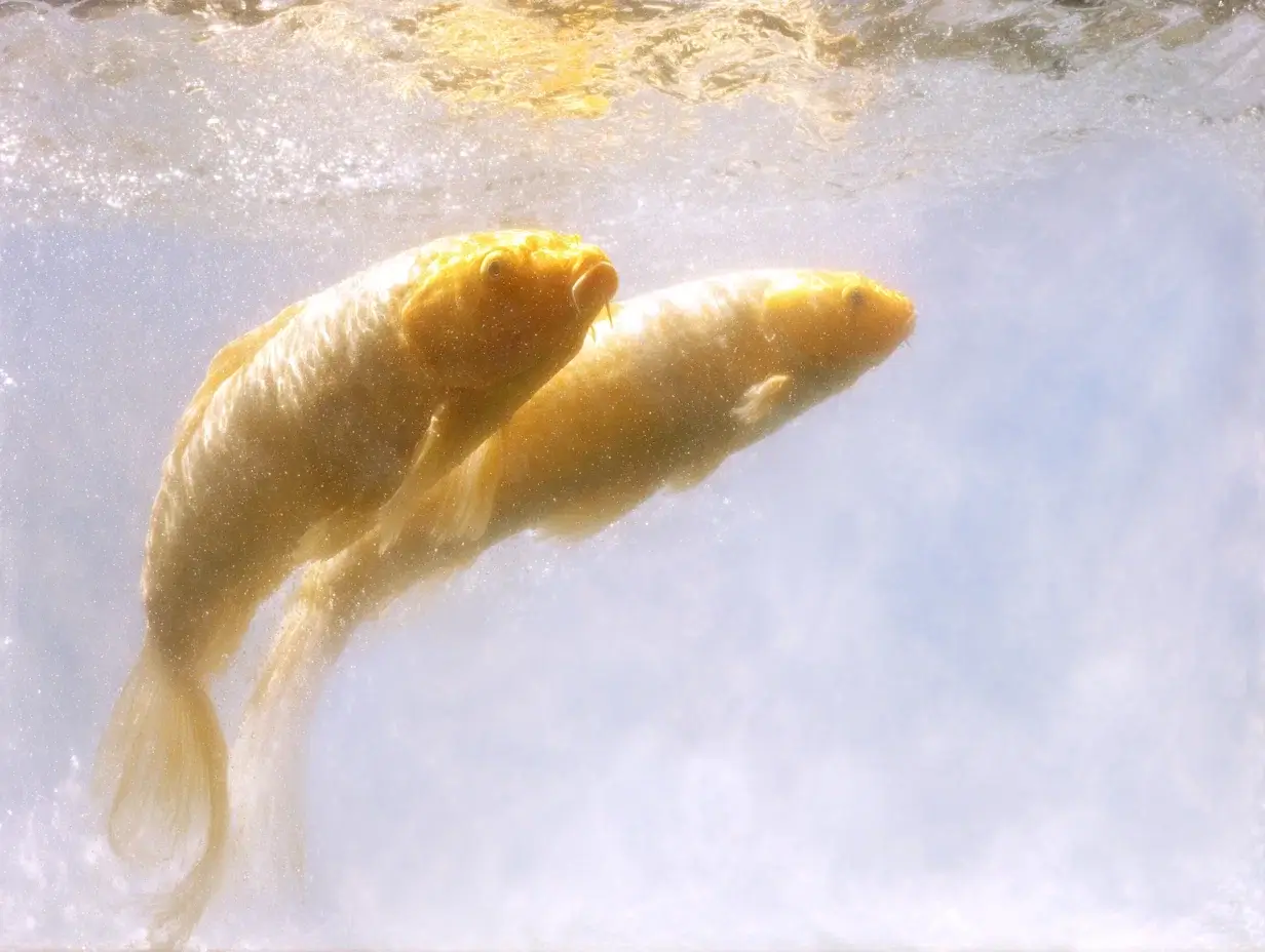 long shot, Blank space on the screen, No shadows, two koi fish float on the clear white water surface, forming a yin-yang taiji pattern. delicate water droplets dotted among them, reflecting a sparkling luster. The water ripples gently, and the sunlight shines through the surface of the water, emitting gentle light and shadow. The whole picture is pure and soft, like a dynamic natural painting