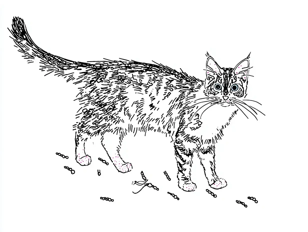 a simple, messy line drawing of a mixed breed cat. The legs has sweet dots. The eyes are unregular abd inside ofthe white of the eyes aswell. in the style of children