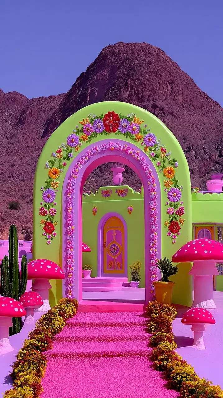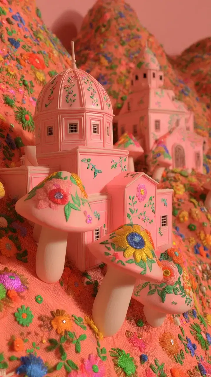 surreal retrofuturistic tribal village with intricate details adorned with floral embroidery details, giant mushrooms , The holy mountain film as directed by wes anderson, bold patterns and details, playful, psychedelic, minimalist, pop surrealism