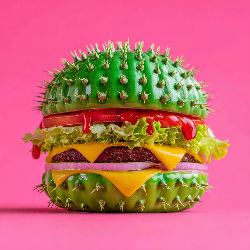 macro photo of a hamburger with a cactus-textured green bun covered in thorns, layered with cheese, tomato, lettuce, and ketchup, bright pink background, soft diffused lighting, pop-art surreal aesthetic. no texture or color change.