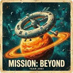Сгенерируй изображение 2:3. Стиль: аутентичный научно-фантастический постер NASA в стиле американских 1960-х годов. Главный объект: тороидальная космическая станция, парящая над светящейся оранжевой планетой с кольцами. Техника иллюстрации: аэрограф, видимый полутоновый растр (halftone) в тенях, состаренная бумага с легкими потертостями по краям. В нижней части постера крупный заголовок в точных кавычках: “MISSION: BEYOND” и мелким шрифтом под ним: “Year 2061”. Космическое пространство — глубокий бирюзовый с туманностями, планета и детали ракеты — раскаленный оранжевый. Никаких современных 3D-рендеров, только аналоговая эстетика печатного плаката.