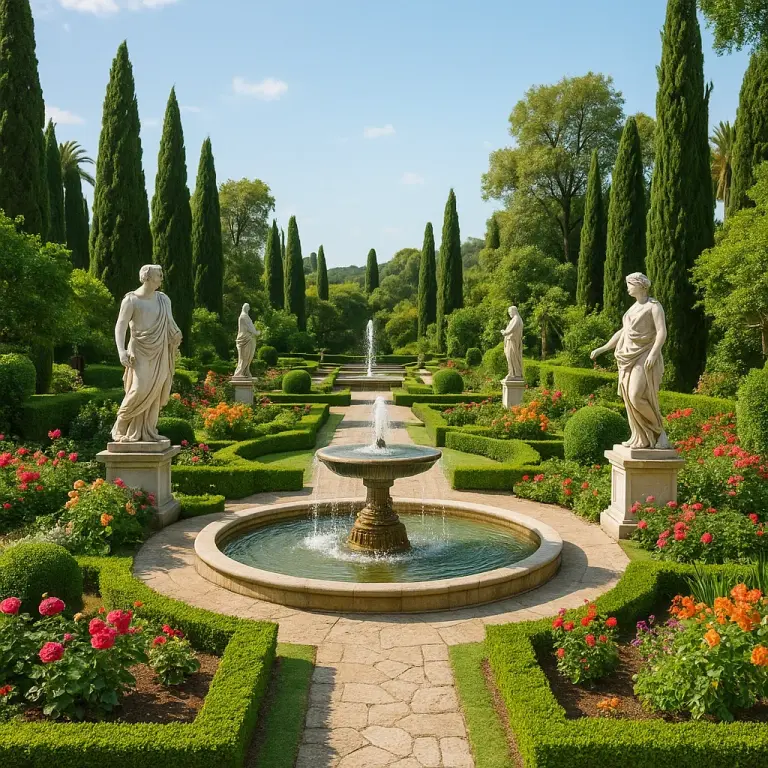 Роскошный итальянский сад в стиле Ренессанса с фонтаном в центре, мраморными статуями, кипарисами и цветущими кустами. Идеальная симметрия, солнечный день, реалистичный живописный стиль.