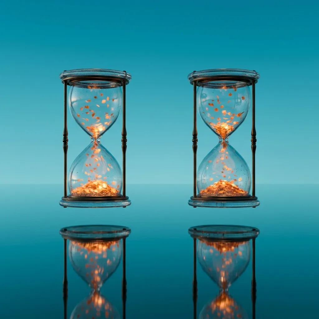 Сгенерируй изображение 1:1. Сцена: пара гигантских прозрачных песочных часов парит над абсолютно зеркальным озером в полной тишине. Вместо песка внутри медленно пересыпаются крошечные светящиеся оранжевые осенние листья — они слегка размыты в движении. Стекло часов должно быть реалистично прозрачным с преломлениями и бликами. Небо — насыщенный бирюзовый цвет ранних сумерек, горизонта не видно, небо плавно отражается в воде. Никаких людей, облаков или посторонних объектов в кадре. Освещение мягкое, равномерное, без резких теней. Гиперреализм, разрешение 8K.