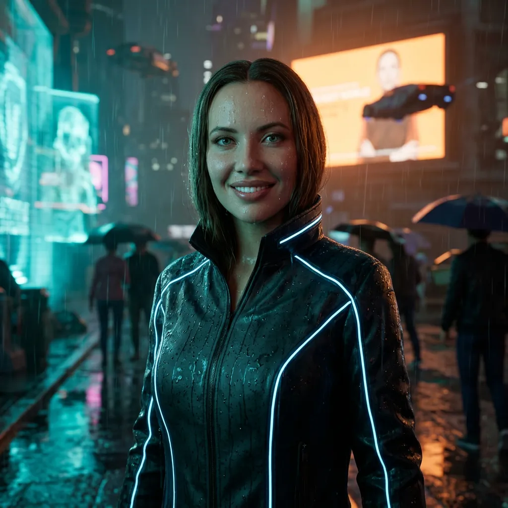 Возьми внешность человека на фото и помести его в сцену в стиле высокодетализированного киберпанка. Формат 1:1. Герой стоит на оживленной улице мегаполиса ночью под проливным дождем, одет в технологичную куртку с тонкими неоновыми полосками по швам. Освещение сцены: бирюзовый рассеянный свет от светящихся голограмм слева, и горячий оранжевый контровой свет от рекламной вывески сзади-справа. На коже и куртке должны реалистично блестеть мелкие капли воды. Рендер в стиле Unreal Engine 5. Не добавляй никаких маскировок лица, шлемов или очков — лицо должно быть открытым и четко различимым. Кинематографичная глубина резкости, фон слегка размыт.