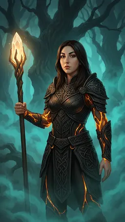 Преврати человека с фото в правителя древнего темного леса. Формат 2:3. Персонаж облачен в доспехи, вырезанные из черного дерева с глубокой резьбой в кельтских узорах. В местах стыков доспеха видны прожилки янтарного вещества, которое мягко светится изнутри теплым оранжевым. В правой руке — высокий посох с огромным светящимся кристаллом. Вокруг клубится плотный бирюзовый туман, за спиной — силуэты гигантских деревьев уходят вверх за кадр. Освещение сугубо от посоха и свечения доспеха. Цифровая живопись уровня концепт-арта AAA-игры, volumetric lighting, максимальная детализация брони. Лицо должно быть четко видно.