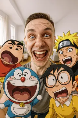 Промт: Ultra-realistic 9:16 vertical format fisheye selfie of me with [Shinchan, Doraemon, Naruto, Nobita]. We’re all making silly, exaggerated faces. Set in a small, bright living room with white tones. High camera angle. Extreme fisheye distortion. Realistic, cinematic lighting, anime characters integrated with stylized realism.