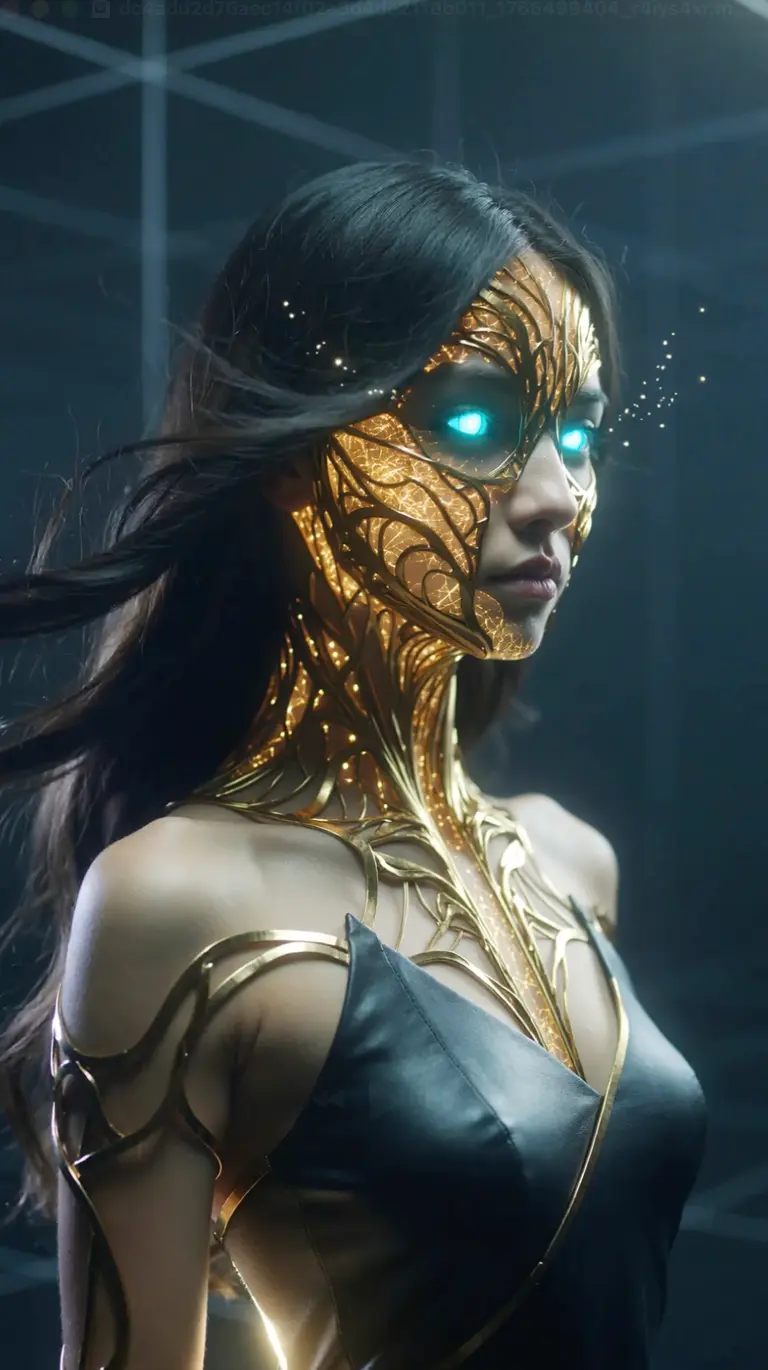 Цифровая Афродита: Лицо модели, покрытое сложной 3D-графикой из золотых нитей, которые постоянно переплетаются. Глаза модели светятся мягким бирюзовым светом. Эстетика цифрового искусства.