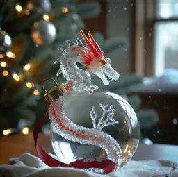 Миниатюрный дракон, сделанный из выдувного стекла, обвивает рождественский шар. Дракон оживает, выдыхает ледяной пар, и шар покрывается инеем. Невероятная детализация текстуры стекла и льда.