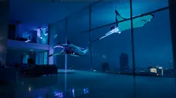 Аквариум в пентхаусе: Огромная стена-аквариум в темном интерьере. Внутри плавают скаты, чьи тела светятся неоном. Снаружи, за панорамным окном, идет дождь, и капли на стекле смешиваются с бликами от воды.