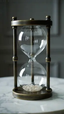 Песочные часы, стоящие на мраморном столе. Вместо песка вниз сыплются мелкие необработанные алмазы. В нижней части часов из алмазов формируется человеческое сердце. Глубокое боке.