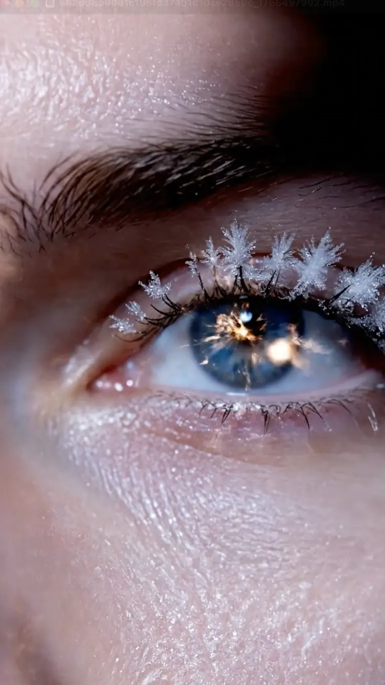 Экстремальный макро-план лица модели с кожей, напоминающей белый фарфор. На ресницах медленно нарастают фрактальные ледяные кристаллы. Глаза — глубокого сапфирового цвета, в них отражается мерцание бенгальских огней. Свет: боковой, драматичный «Chiaroscuro». Движение: медленный зум в зрачок.