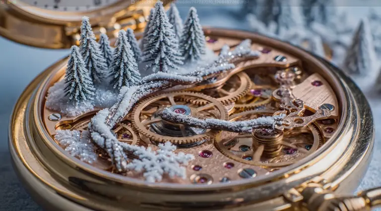 Сложный внутренний механизм золотых карманных часов. Вместо деталей — микроскопический зимний лес, покрытый инеем. Механика и природа сливаются. Невероятная детализация, стиль стимпанк-люкс.