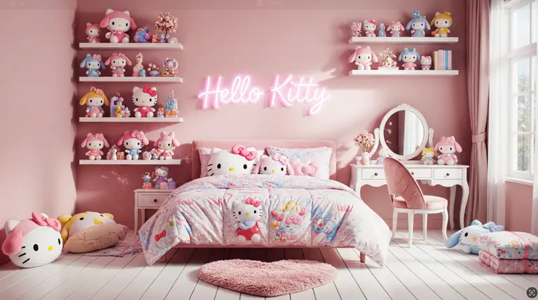 { "description": "Photorealistic cinematic shot of an empty pastel-pink bedroom with white wood floors and soft daylight streaming in. A sealed Hello Kitty box with a pink bow sits in the center. It wiggles, then bursts open in a bright, sparkly puff. The room transforms instantly into a cozy, detailed Hello Kitty sanctuary. No on-screen text.", "style": "photorealistic cinematic", "camera": "fixed wide angle, front-facing for symmetrical reveal", "lighting": "soft, diffused natural light with subtle pink glow accents and gentle lens bloom", "room": "blank pastel bedroom transformed into a Hello Kitty-themed space with warm, playful atmosphere", "elements": [ "Hello Kitty box (logo and bow clearly visible)", "Hello Kitty bedding and pillows", "plushies (Hello Kitty, My Melody, Cinnamoroll, Kuromi)", "framed wall art with stylized 'Hello Kitty' lettering in pink cursive on the wall behind the bed", "floating shelves with figurines and pastel accessories", "vanity with mirror and pink chair", "Hello Kitty lamp or soft neon wall sign shaped like the cat face", "heart rug or fluffy floor mat", "bow-shaped throw pillows" ], "motion": "box opens, cute Sanrio items explode out and assemble rapidly and precisely around the room", "ending": "soft, cozy Hello Kitty bedroom glowing with pink warmth, sparkles drifting, 'Hello Kitty' lettering softly lit on the wall", "quality": "ultra realistic, crisp focus, clean surfaces, soft fabric textures, accurate reflections", "resolution": "4K UHD", "details": "visible fabric fibers, plush textures, natural shadow gradients, light diffusion through curtains", "text": "none", "keywords": ["Hello Kitty", "Sanrio", "pink bedroom", "cute decor", "4K cinematic", "realistic lighting", "no on-screen text"] }