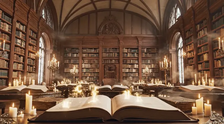 Магический реализм. Интерьер роскошной библиотеки. Из раскрытых старинных книг вырываются золотые искры и буквы, сплетаясь в огромную световую инсталляцию. Мягкий свет свечей, пылинки в воздухе.