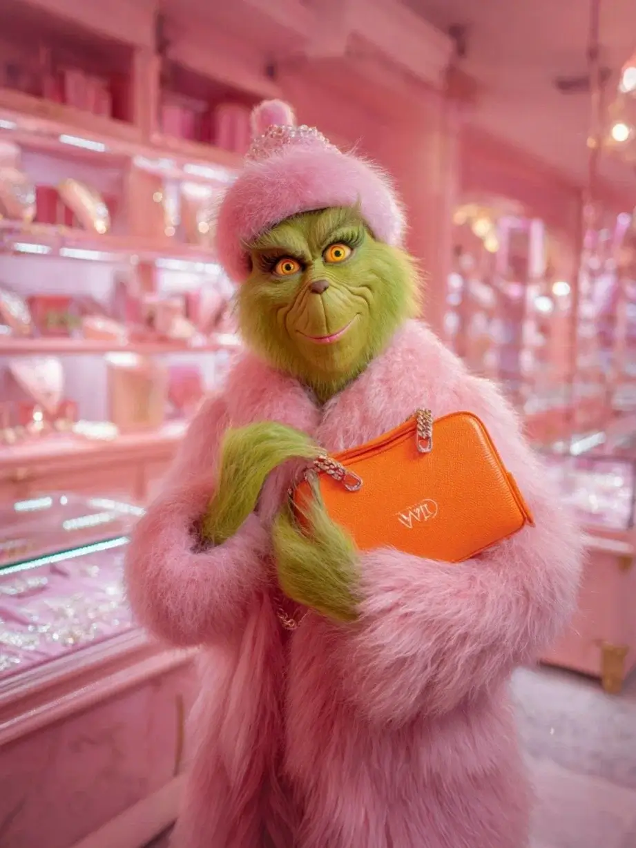 vertical photo of a green furry character wearing a fluffy pink fur coat and matching hat, standing in a luxurious pink jewelry boutique filled with glass shelves and sparkling gems, holding two bright orange VLV bags. Soft glossy lighting, high contrast pink-orange palette, reflective surfaces, playful glamour style. no color shift, no object change, no extra props