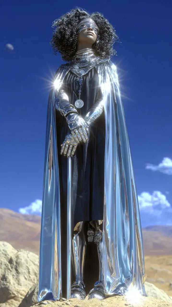 realistic silver goddess standing on a desert-like planet under violent storm, acid crystal rain and swirling winds, wearing reflective chrome armor and crystal ornaments, metallic fabric flowing in air, oily rainbow reflections on sand, mix of beauty and chaos, cinematic realism