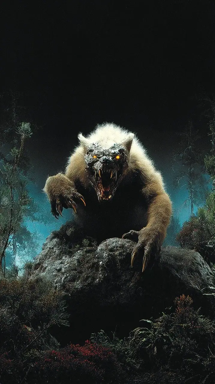 concept art di una donna con una terrificante maschera da Lupa. Ha un costume che richiama la Lupa, la testa é lo skull della Lupa, i denti famelici e unghie come artigli, ambientato in una foresta buia. Ha strati di pelle di lupo come outfit. Gli occhi della Lupa brillano nel buio