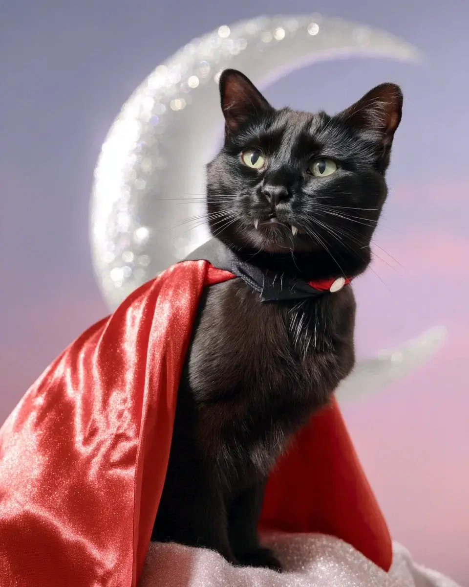 black cat vampire with small visible fangs, wearing red satin cape with black inner lining and tiny ribbon bow, sitting elegantly on a silver crescent moon surrounded by glowing stars, pastel lavender night sky, cinematic soft light, gentle sparkle on fabric, vintage 35mm film grain, cute fantasy postcard mood, empty space for text