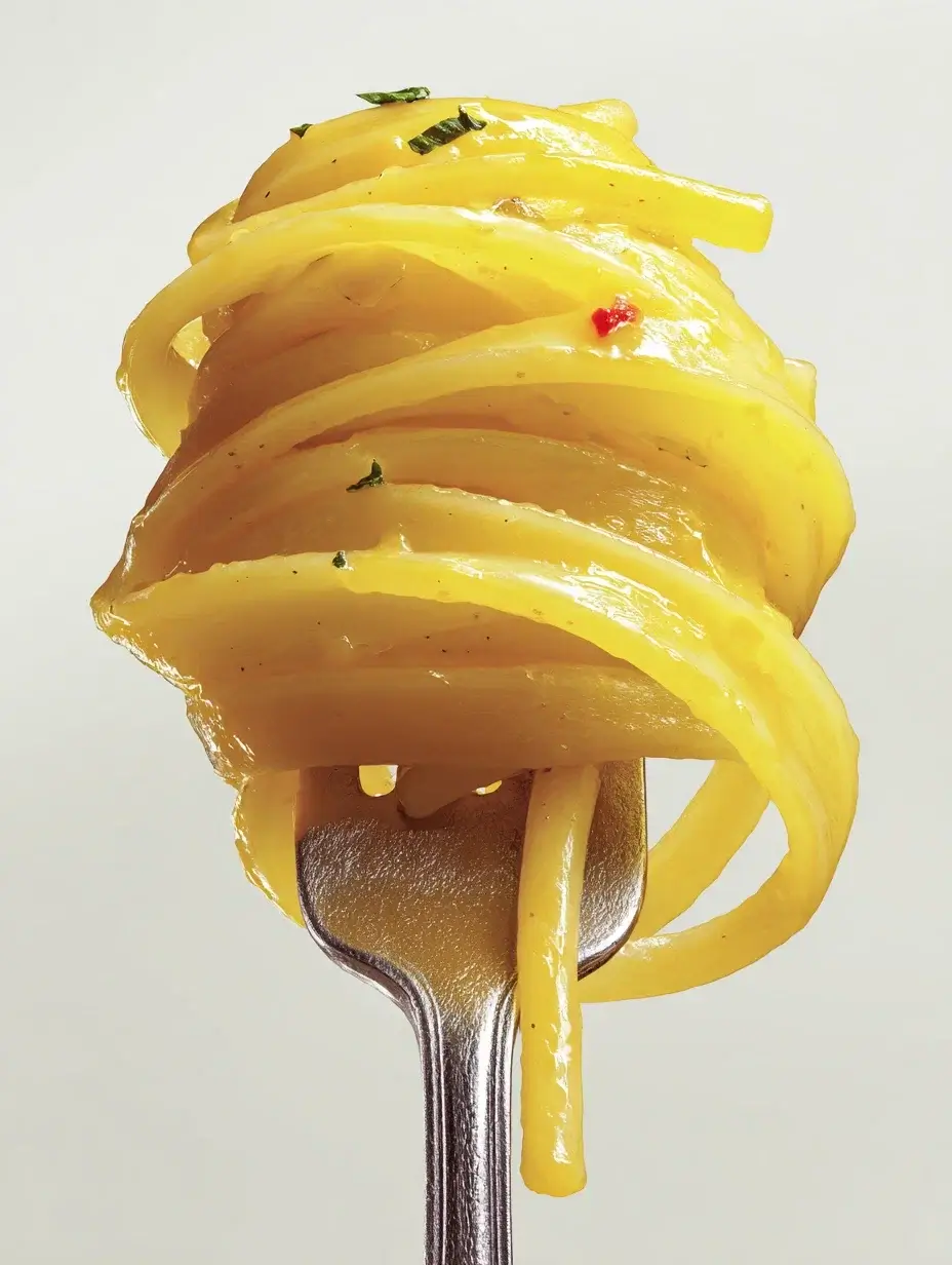 a fork with spaghetti wrapped around it, vibrant yellow pasta sauce on the fork, against a white background, close-up shot from above, in an illustration style, with a delicious and appetizing effect, in the style of an advertising poster, high resolution, and a hyper-realistic appearance