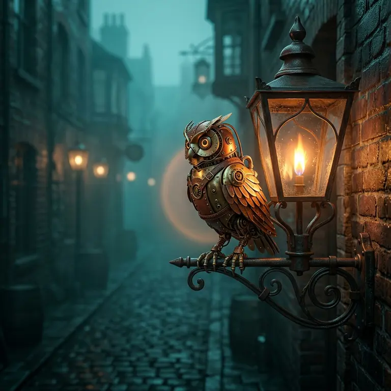 Сгенерируй изображение 2:3. Персонаж: маленькая механическая сова с детализированными перьями из полированной латуни, состаренной медью и кожаными заклепками. Сова сидит на старинном уличном фонаре в викторианском переулке поздним вечером. Из фонаря льется теплый оранжевый свет, создавая мягкий круг освещения вокруг птицы и подсвечивая каждое металлическое перышко снизу. Переулок за фонарем окутан густым бирюзовым вечерним туманом. Стиль рендера: 3D-анимация уровня Pixar, ray tracing, реалистичные PBR-материалы металла и кожи. Задний фон мягко размыт (боке f/1.4).