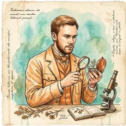 ботанического альбома XIX века. Формат 1:1. Персонаж одет в светлый холщовый костюм исследователя, держит в руке старинный медный компас и лупу. Техника: акварельная живопись на шероховатой плотной бумаге с тонкой штриховкой линером поверх. Фон — размытые акварельные пятна глубокого бирюзового цвета. Одежда и аксессуары — теплые оранжевые тона. Добавь реалистичную текстуру состаренной бумаги, лёгкие потеки краски по краям. Никаких цифровых артефактов или современных элементов.