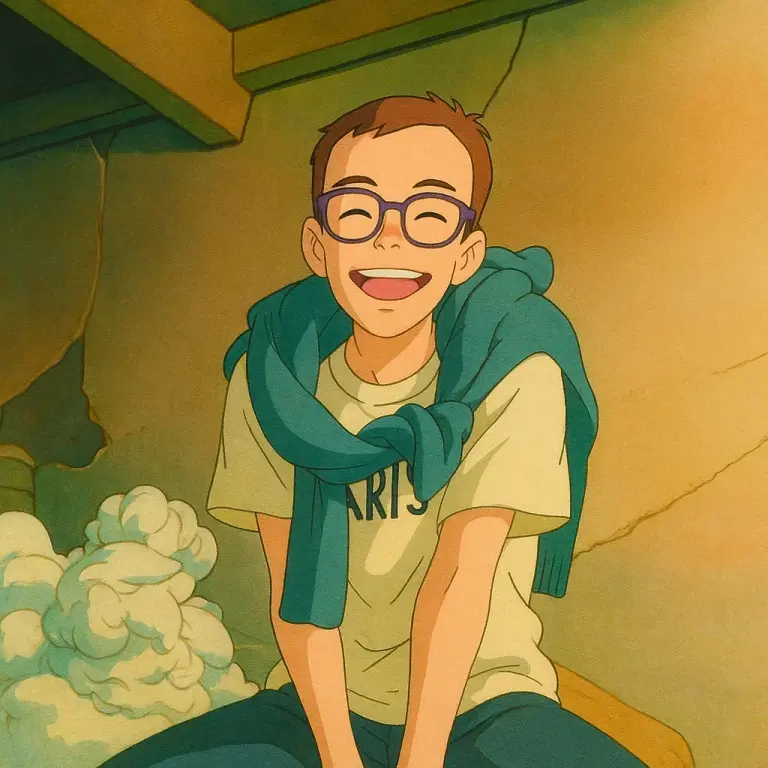 A cheerful young man wearing glasses, sitting indoors with a light sweater tied over his shoulders, smiling brightly. Studio Ghibli animation style, warm lighting, cozy atmosphere, soft painterly shading.