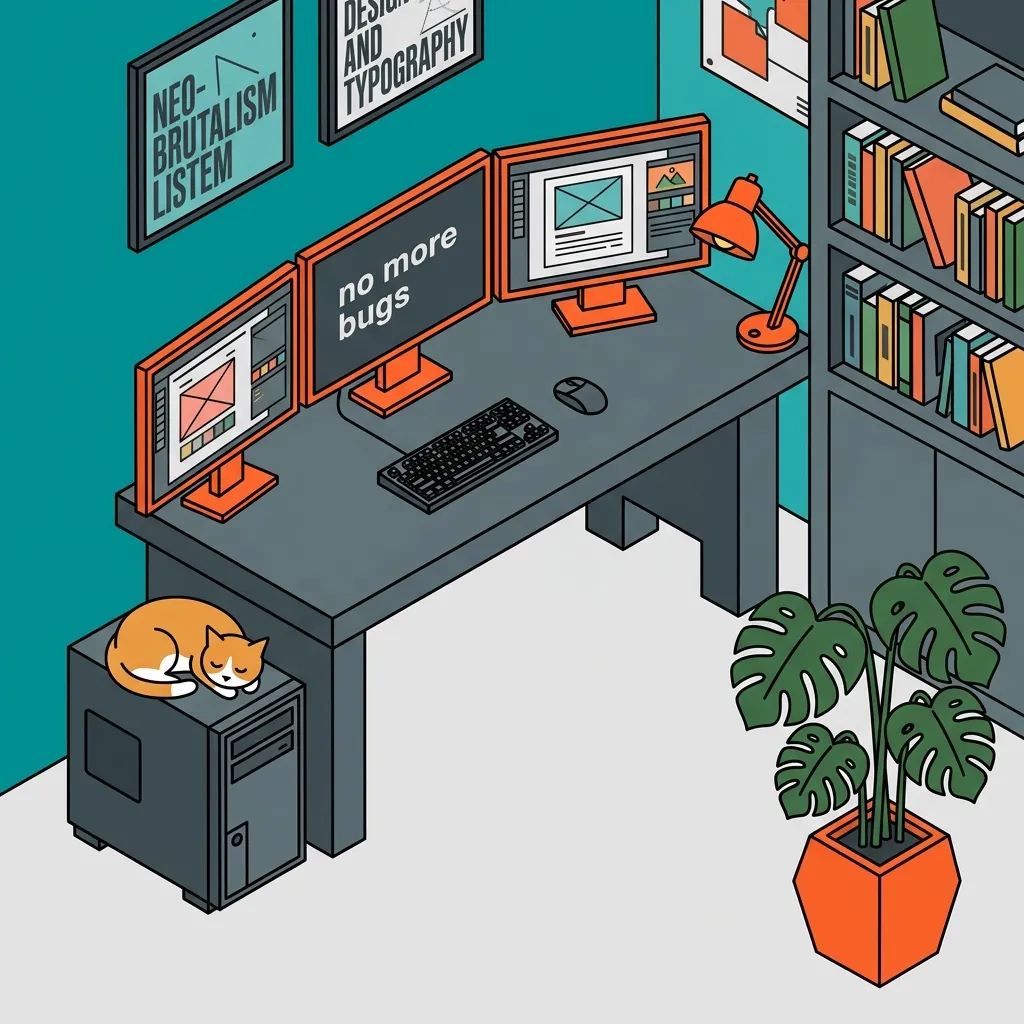 Сгенерируй изображение 1:1. Стиль: современный изометрический флэт-дизайн с элементами нео-брутализма. Детализированная изометрическая комната дизайнера: несколько мониторов с открытыми проектами, стеллаж с книгами, крупный monstera на полу, рыжий кот спит на системном блоке. Все объекты имеют толстый черный outline (2-3px), никаких теней или градиентов — только матовые плоские заливки. Стены и фон — насыщенный бирюзовый. Мониторы, горшок кота и акцентные детали — ярко-оранжевые. На одном из экранов напиши точный текст: “no more bugs”. Строгая изометрия, все линии ровные.