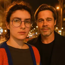 Сделай совершенно обычное селфи на iPhone с моей загруженной фотографией и рядом стоит Бред Пит. Фотография слегка размыта, как будто сделана в спешке и небольшом движении. Освещена уличными фонарями, на заднем плане изображена оживленная городская обстановка ночью, теплые оттенки