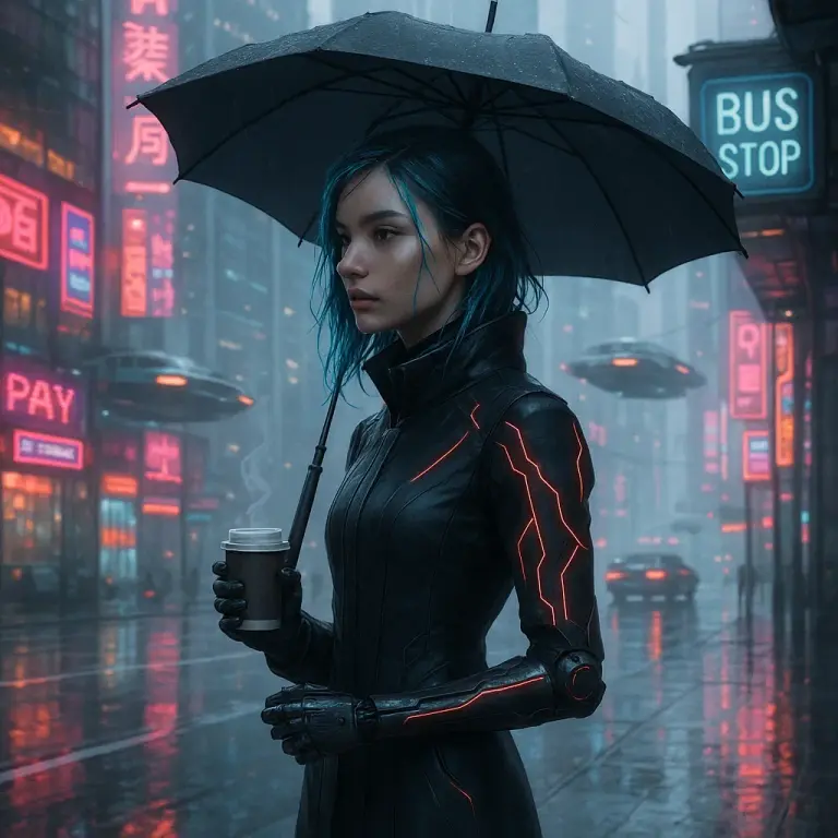 Девушка-киборг с голубыми волосами стоит под чёрным зонтом в дождливом неоновом городе будущего. На её костюме светятся красные линии, в руке — стакан кофе. Киберпанк-атмосфера, влажные улицы, туман, фотореализм.