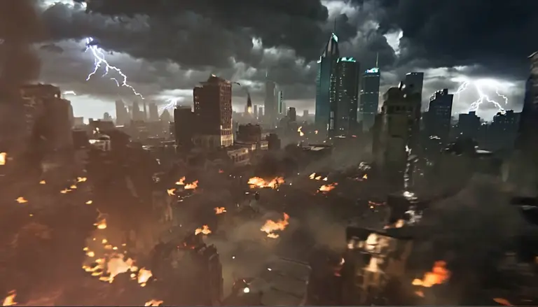 Real-time playback. Wide shot of a ruined city: collapsed towers, fires blazing, storm clouds with lightning. Camera drops fast from the sky over burning streets and tilted buildings. Smoke and dust fill the air. A lone hero walks out of the ruins, silhouetted by fire. Camera shifts front: his face is dirty with dust and sweat, eyes firm, a faint smile. Wind blows, debris rises. Extreme close-up: his eyes reflect the approaching enemy. Music and drums hit. Final wide shot: fire forms a blazing halo behind him — reborn in flames with epic cinematic vibe.