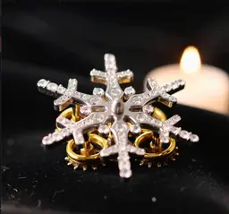 Механическая снежинка: Макросъемка. В центре кадра на черном бархате лежит снежинка, которая на глазах превращается в сложный механизм из белого золота и мелких бриллиантов. Зубчатые колесики вращаются, отражая теплый свет свечей.