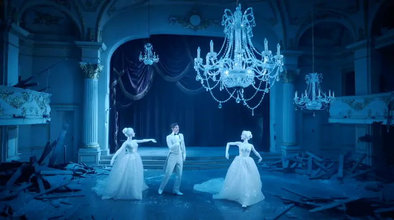 Заброшенный оперный театр, залитый льдом. По залу кружатся призрачные пары в нарядах 19-го века, сотканных из света и снежной пыли. Хрустальные люстры медленно раскачиваются.