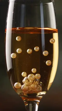 Крупный план бокала. Пузырьки шампанского при подъеме превращаются в крошечные жемчужины, которые вылетают из бокала и зависают в воздухе, образуя форму новогодней елки.