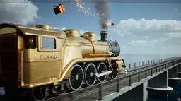 Роскошный золотой поезд мчится по виадуку над замерзшим океаном. Из трубы вылетают не искры, а светящиеся подарки и конфетти. Камера летит сбоку, фиксируя отражения в начищенных бортах вагонов