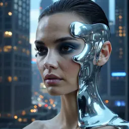 Портрет модели, чье лицо наполовину скрыто маской из перетекающего жидкого серебра. Металл движется как живая ртуть, отражая огни футуристичного города. Стиль: High-tech luxury.